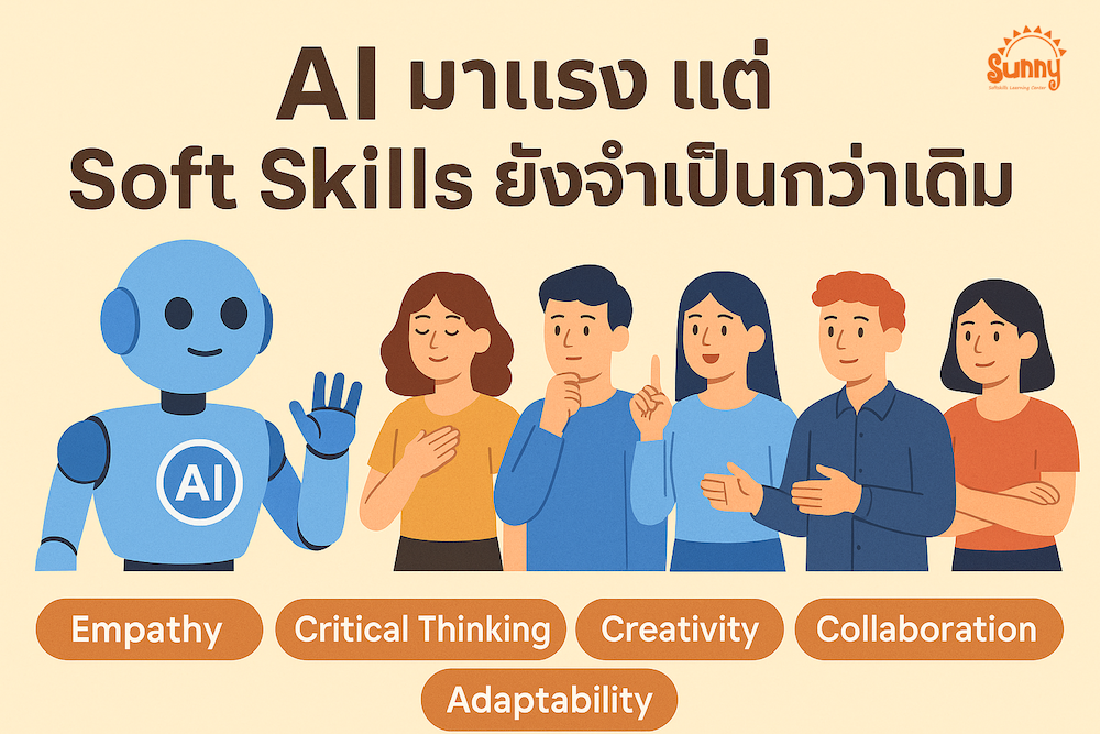 แม้ว่า AI จะช่วยประหยัดเวลาและเพิ่มประสิทธิภาพในการทำงานได้จริง แต่ ยังมีหลายอย่างที่ AI ไม่สามารถทำแทนมนุษย์ได้โดยสมบูรณ์ และสิ่งนั้นก็คือ “Soft Skills” หรือที่เรียกกันว่า ทักษะที่เกี่ยวกับการสื่อสาร อารมณ์ และการทำงานร่วมกับผู้อื่น